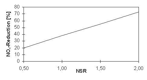 自由基之间的反应选择性并不是很强。因此充足的脱除添加剂还是必要的。图1显示了烟气温度950℃时化学配比因子NSR与NOx脱除量的关系。
